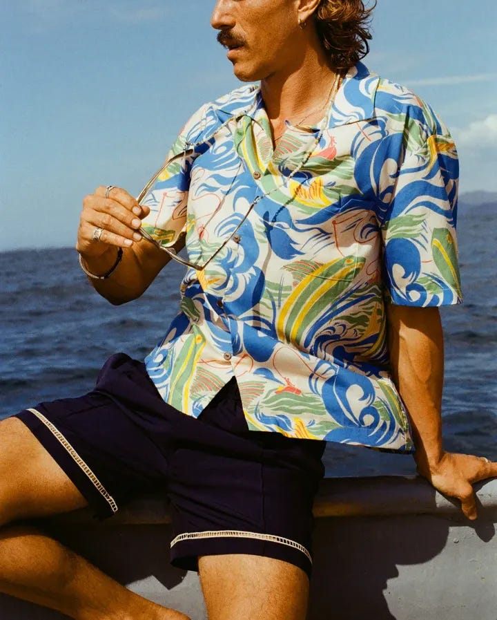 A playful, artistic take on the Hawaiian shirt with whimsical fishing illustrations and retro flair that feels straight out of a well-curated vintage shop.
