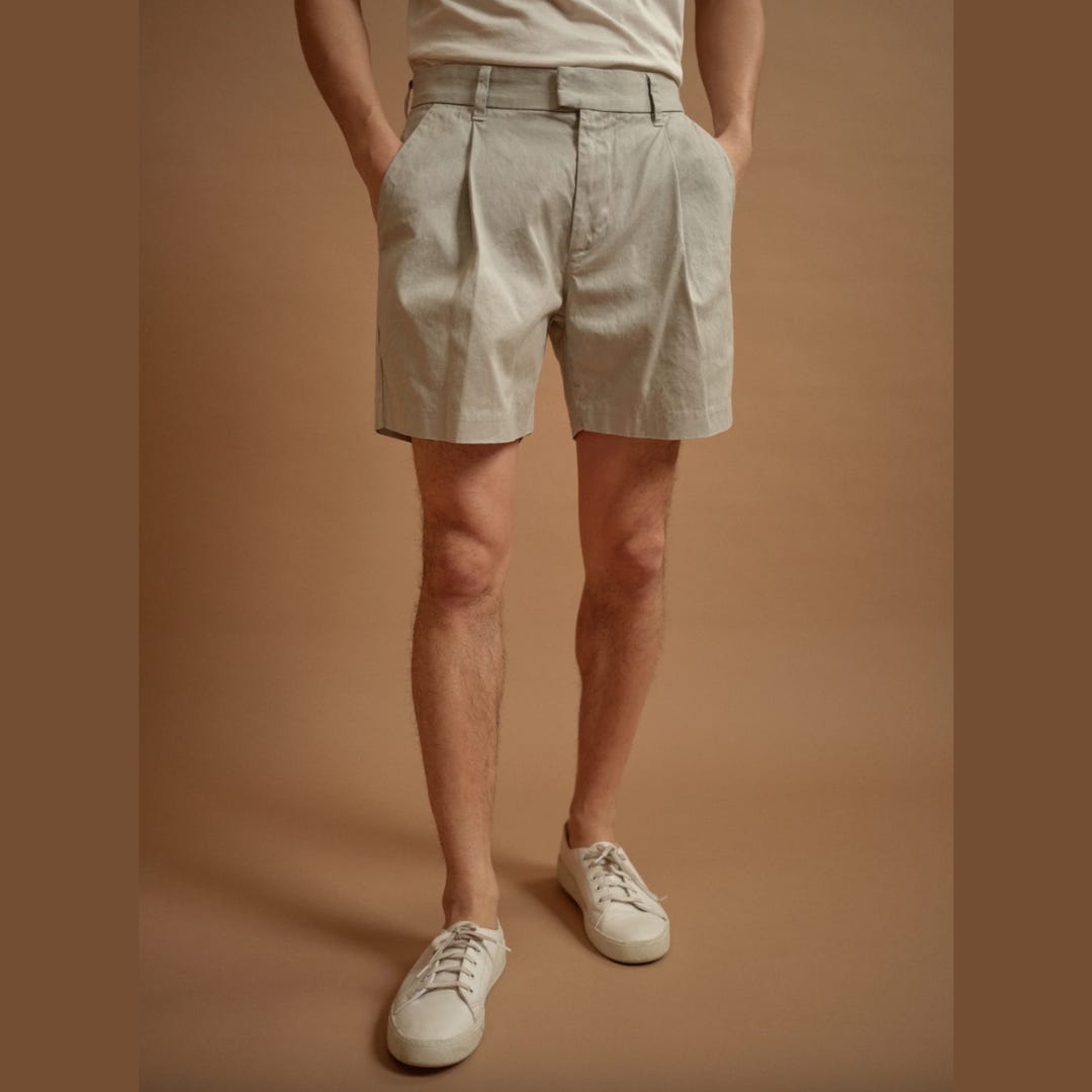 Pleated and breezy, with a nod to vintage Americana, these cotton-hemp twill blend shorts offer structure without stiffness. Win, win.