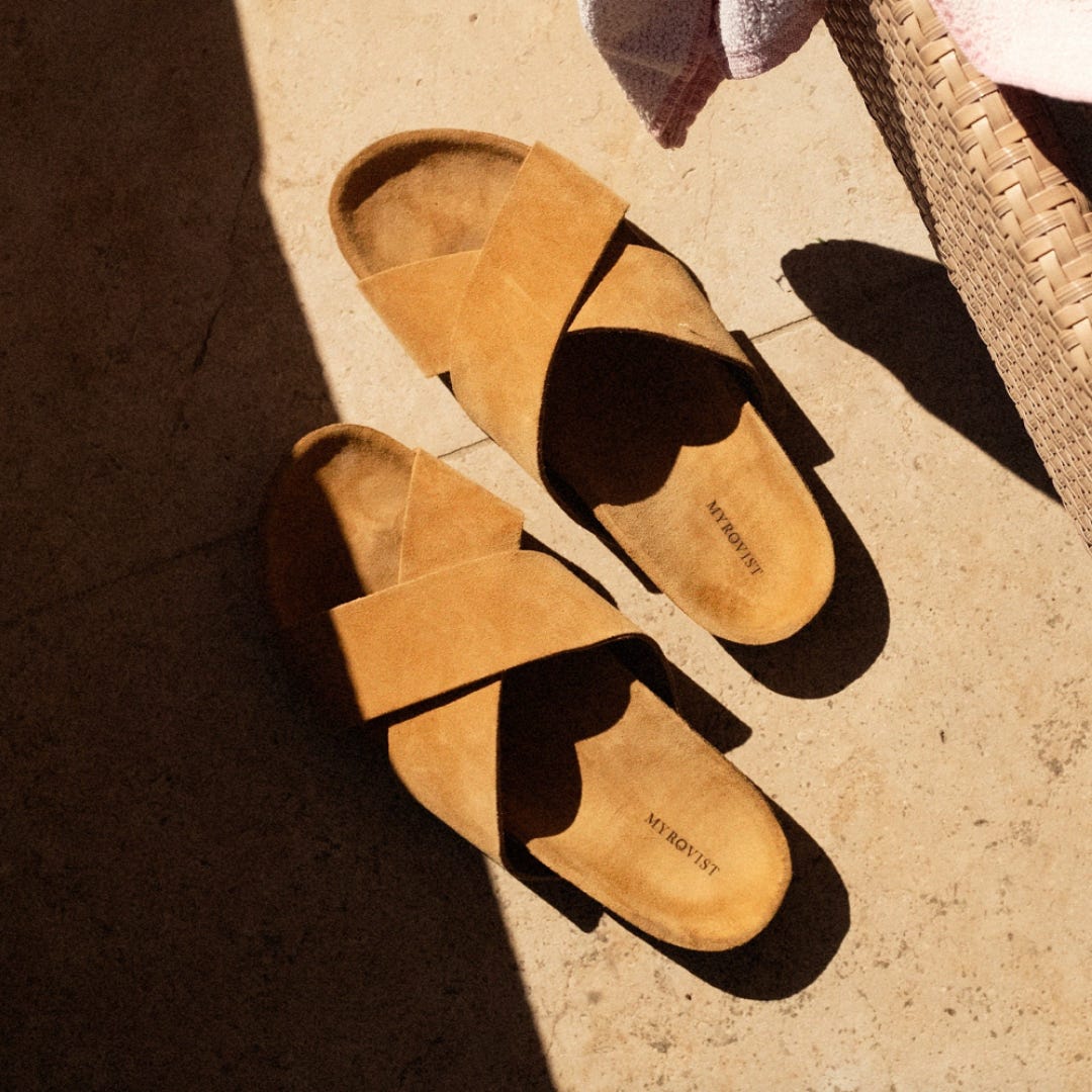 Better: Myrqvist Suede Minimal Cross Strap Sandals, $199