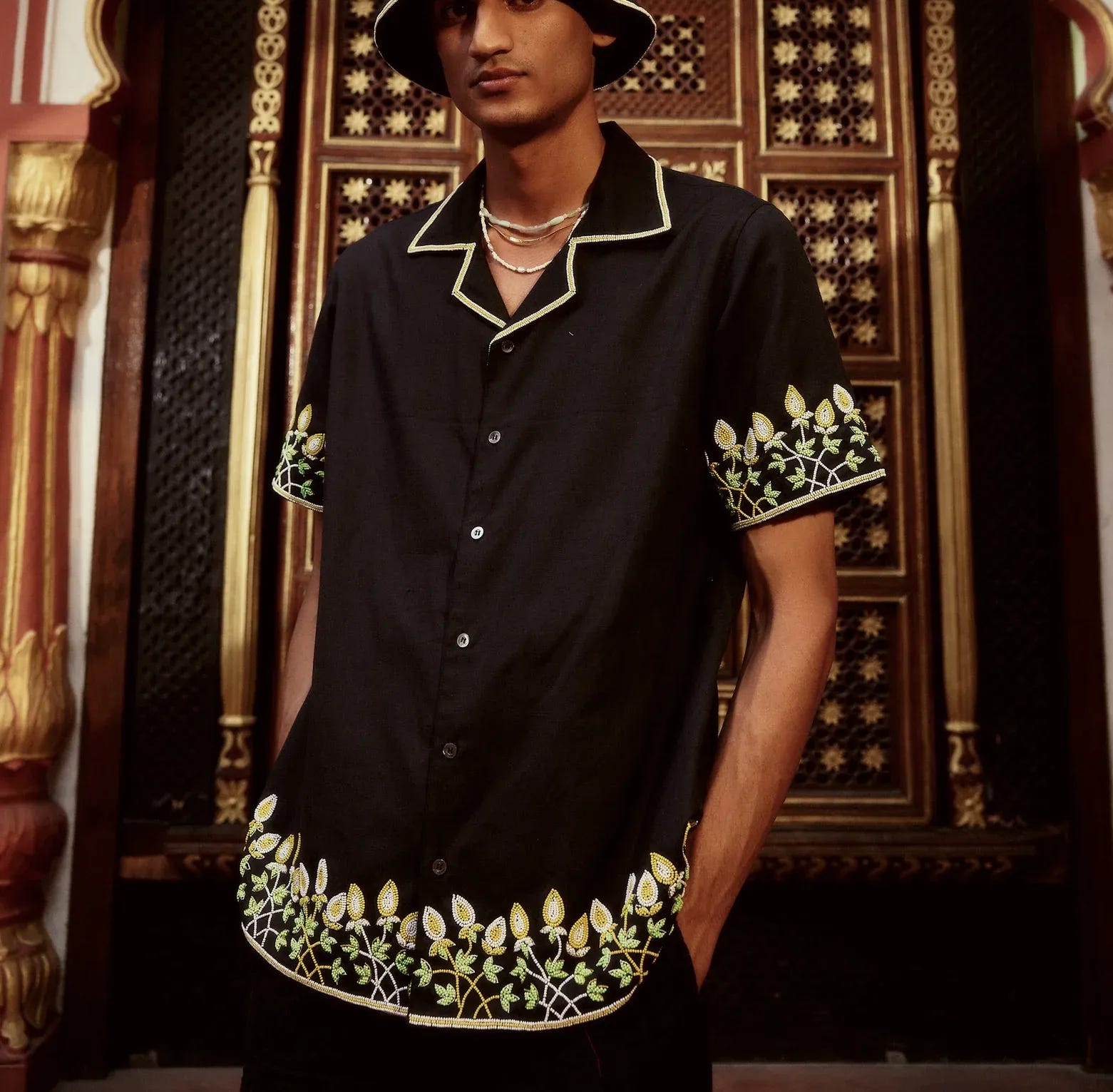 From New Delhi-based brand, Perte d’Ego, this camp collar shirt elevates the typical floral motifs with beaded borders and tonal detailing, offering a standout look that’s still easy to wear.